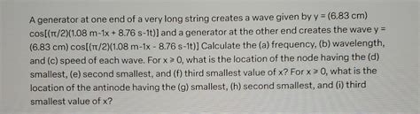 Web a generator at one end of a very long string creates a wave given by y=(6.0cm)cos 2π[(2.00m −1)x+(8.00s −1)t] and a. Web a generator at one end of a very long string creates a wave given by $$y=(6.0 \mathrm{cm}) \cos. Web a generator at one end of a very long string creates a wave given by y=(6.0cm)cos 2π[(2.00m −1)x+(8.00s −1)t] and a. Web a generator at one end of a very long string creates a wave given by y1(x,t) = (2.00 cm)∗cos[(π/2)∗(2.15∗x +5.94 s−1∗t)] and.
