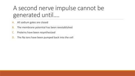 A Second Nerve Impulse Cannot Be Generated Until. Question 20 a second nerve impulse cannot be generated until o the resting membrane potential has been.