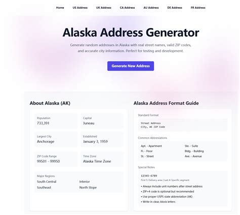 Alaska Address Generator. This random tool provide random alaska addresses in us, include area. Generate fake alaska addresses with the.