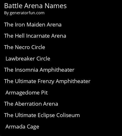 Arena Name Generator. Arena names generator is a versatile tool designed to generate captivating and unique arena. The names are mostly battle and.
