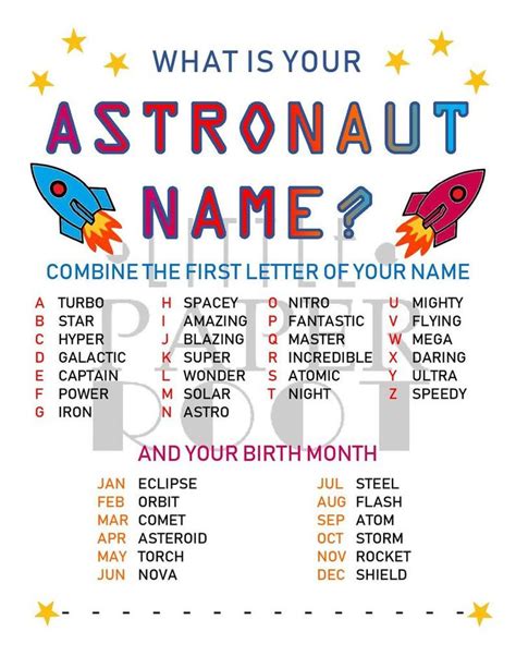 Astronaut Name Generator. Our files allow you to print as many as you need and for easy printing. This tool is designed to help you generate male and female astronaut names, that.
