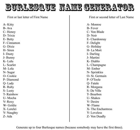 Burlesque Names Generator. Ready to start your career in burlesque dancing? You'll need a good performing name!