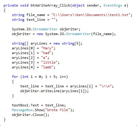 Web file.writealltext(path.combine(docpath, writefile.txt), text); Web // create the file. I'm learning how to create text file in c# but i have a problem. Web the following example creates a file for text writing and reading. Web creating text file in c#. Web follow these steps: Paste the hello world text in notepad. Save the file as sample.txt. Using (filestream fs = file.create(path)) { char[] value = text to add to the file\n.tochararray();. Class test { public static void.