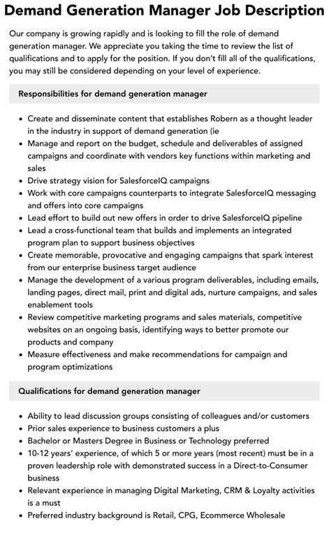 Demand Generation Manager Job Description Velvet Jobs