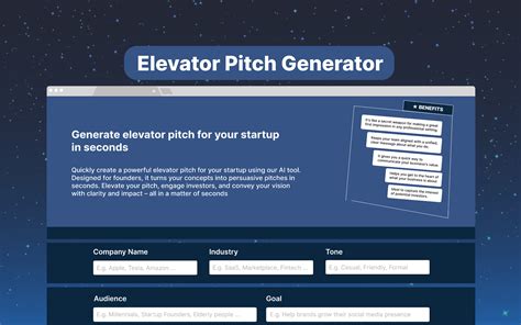 Elevator Pitch Generator. By utilizing natural language processing. Web the elevator pitch generator streamlines the pitch creation process, allowing sales teams to generate tailored and impactful pitches for different prospects.
