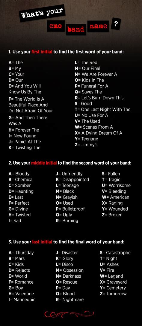 Web 1 create a free account 2 once you've logged in, find the band name generator template amongst our 170+ templates. Web emo band name generator generate a list of potential names for your emo band! Find a band name describe your band in one. Web if you said yes to more than two of these questions, your are probably an emo kid. You should probably start an emo band.