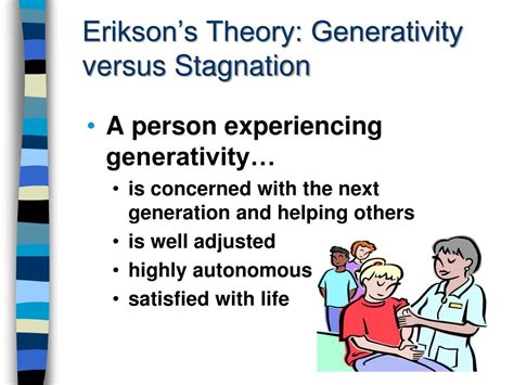 Erikson's Generativity Versus Stagnation. Generativity versus stagnation is the seventh of eight stages of erik erikson’s theory of psychosocial development. This stage takes place during during middle.