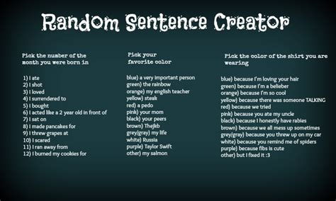 Funny Random Sentence Generator. Generate some crazy and unique sentences with the random. Jump down to the generator.