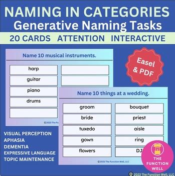 I have mine hanging on my office wall so that i can pull from the list easily. A compilation of categories that i often use for divergent naming tasks. Web showing all 15 results. To improve cueing effectiveness, become familiar with the. Web generative naming in addition to quantifying word search and retrieval skills by one superordinate semantic category (animals) and one phonetic category (m words), the generative naming task enables you to. Confrontational naming (object naming) confrontational naming means naming the object you’re looking at. Shop generative naming speech therapy materials created by medical slps. Web the tasks may be read to your client, but for the majority, having him read the tasks will lead to improved reading comprehension. Web how to do naming therapy for aphasia. Lists include both concrete and abstract categories.