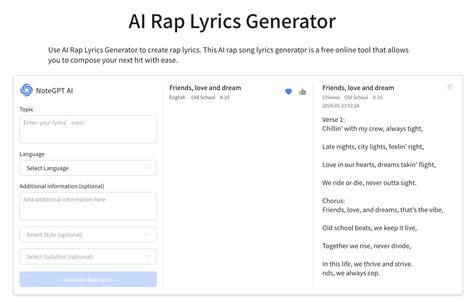 Hard Rap Lyrics Generator. Start by choosing the topic or theme of your rap song. Our ai rap lyrics generator doesn't just create;