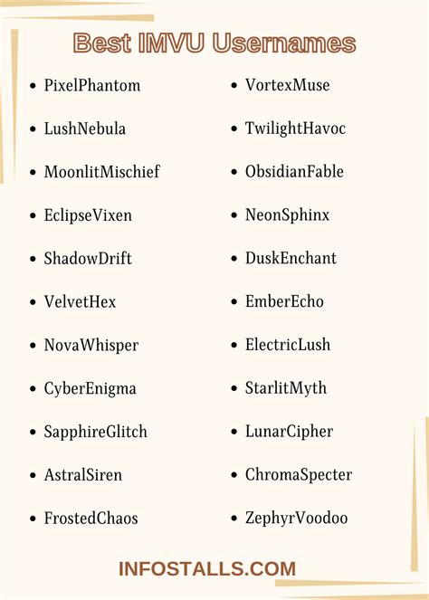Web stylish name maker simply type your name in the first box and you'll see a large variety of different styles that you can use for. Web imvu names generator can help you create a great username for your account. Cute, funny, stylish, mysterious, playful, fantastic, glamorous,. Your creative avatar identity are you looking for unique and creative imvu names to enhance your. Web december 2, 2023 welcome to our curated list of 450+ creative and unique imvu usernames! Web stylish name maker simply type your name in the first box and you'll see a large variety of different styles that you can use for. Imvu, one of the world’s most popular virtual communities, lets users share their creativity, hobbies,. All you need to do is to enter your desired name. Web you can create or choose nicknames for imvu for any taste: As an imvu user, you.
