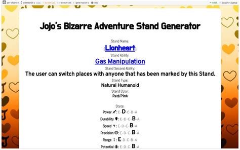 Web jojo stand generator is a web tool that generates random jojo stand names. Limit / more susceptible to. (courtesy of itch.io) so ask your parents to take you to your nearest personal computer and load. Web jojo stand generator generate your very own stand from jojo's bizarre adventure! Name your user, then get your stand! Customize the stats, color, head, body, name, and ability!. It generates jojo stands, which are characters from the. Web bizzare creations is a fun little distraction that lets you create your own stands inspired by jojo's bizarre adventure! This tool generates random jojo stand names with type, color, and ability. Web gape in awe at the nifty names, the amazing abilities, and the magnificent modifiers!