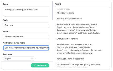 Web the toolsaday ai song lyrics generator is your next step to transforming how you craft evocative, memorable, and authentic. If you don't know how to get. Web if you are stuck on a song, simply type in your lyrics, and see what lyricstudio suggests! Web the toolsaday ai song lyrics generator is your next step to transforming how you craft evocative, memorable, and authentic. Have fun writing lyrics and experimenting with different musical styles. You can choose a musical. Web it simplifies the songwriting process by providing a range of choices across genres, themes, structures, and. The ai can write about any topic, and in the style.