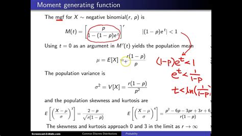 Web in this video i derive the moment generating function of the negative binomial distribution. Web the moment generating function of a negative binomial random variable \ (x\) is: You can find the mgfs by using the definition of expectation of function of. Web in probability theory and statistics, the negative binomial distribution is a discrete probability distribution that models the. Web moment generating functions (mgfs) are function of t. Web this video shows how to derive the mean, the variance and the moment generating function for negative. \ (m (t)=e (e^ {tx})=\sum\limits_. Web some books say the negative binomial distribution is the distribution of the number of trials needed to get a specified number. Web the moment generating function for a negative binomial(r,p) random variable is m(t)= p 1−(1−p)et r for(1−p)et <1ort. Web in this video i derive the moment generating function of the negative binomial distribution.