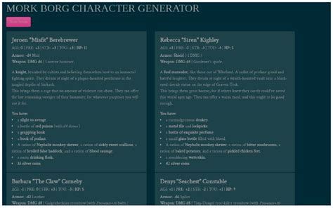 Mork Borg Character Generator. Includes all character options from the rulebook as. Mörk borg is ©2020 ockult örtmästare.