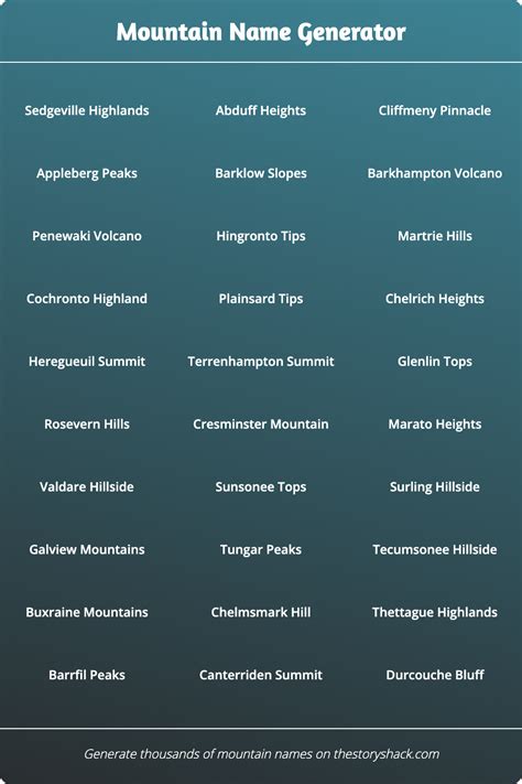 Mountain Names Generator. Web each name generator can provide thousands of name ideas! Elevate your creativity with our mountain range name generator—craft names for majestic peaks and landscapes.