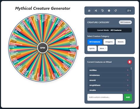 Mythical Creature Generator Wheel. Spin to uncover a diverse array of beings, from aardvarks to. Dragon, centaur, kitsune (ninetail fox), agressive unicorn, kelpie.