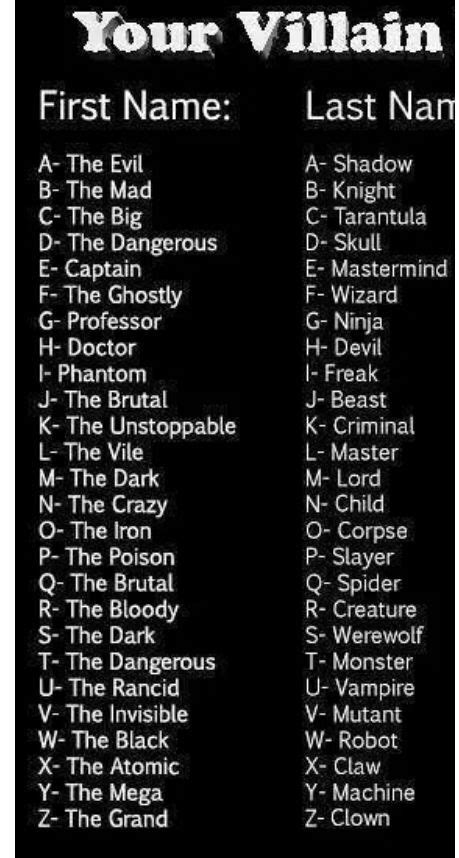 Your Villain Name Villain names, Funny name generator, Funny names