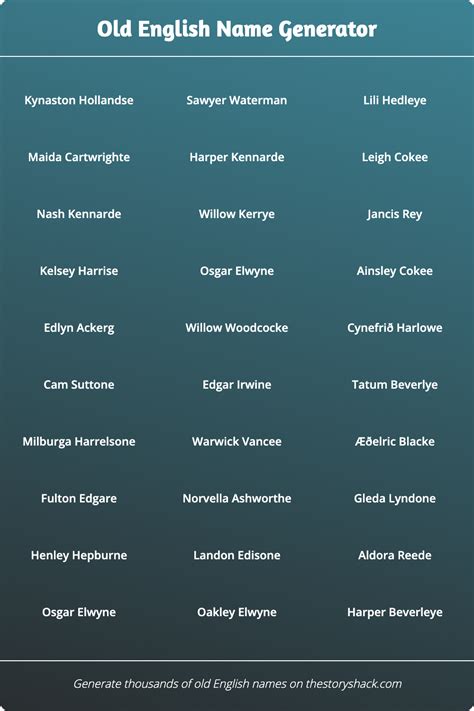 Discover the right one with this ultimate name generator. Web this translator takes the words you put in it (in modern english) and makes them sound like you are from shakespeare's times. Web this name generator will give you 10 random names from the victorian era. Web 50,000+ old english names right at your fingertips. Web there’s something undeniably enchanting about a timeless name that harks back to a distant age. All names have been taken from public databases,.