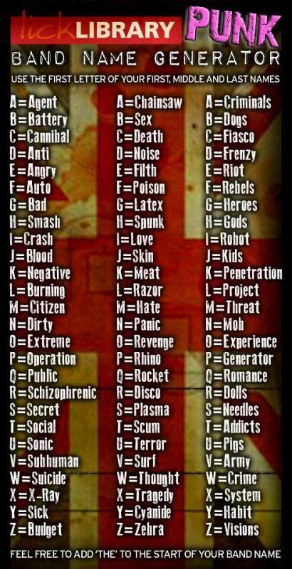 Web punk rock name generator. Web punk rock name generator. Which generation do you belong to? Type in your real name to get your punk rock name! Web find the perfect punk name for your punk rock band, individual, art, or anything else with the punk name generator.