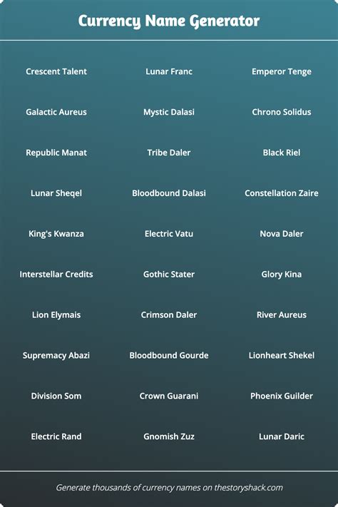 Random Currency Name Generator. There are various different name styles, so there's. Web a currency name generator is a tool that instantly produces randomized fictional money name suggestions at the simple.