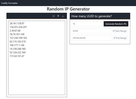 Web open the random ip address generator page at randomgenerate.io. By default, we generate 10 ip addresses but. Use this online random ip generator to generate a list of random ip addresses in the format. Select whether you need an ipv4 or ipv6 ip address. Just press the generate ips button, and you'll. Web world's simplest online random ip generator for web developers and programmers. Web it is easy to process, anyone can generate a list of random ip addresses, by following the steps: Web use our online tool to generate a list of random ip addresses for your need. Web open the random ip address generator page at randomgenerate.io. Web generate a list of ip addresses to spoof your identity, test your system's security, or test your ip filtering regular expression. Enter the version of ip address you.