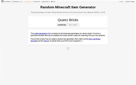 Random Minecraft Item Generator. If you're a perchance builder then you'll probably find some of them useful for importing into your own projects. Web simply generates a random minecraft item at each click (surival items only, bedrock edition 1.16.0) ghast tear randomize the useful generators list is a handy list of simple text generators on various topics.