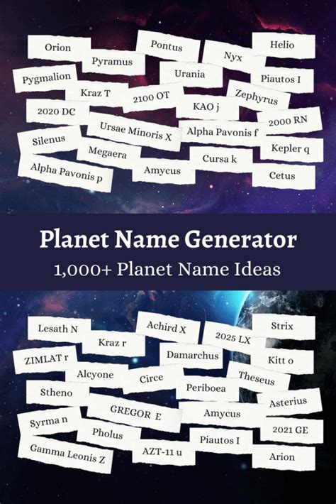 Earth, saturn, uranus and venus are just a selection of planets in our solar system, many named after gods. Web expand your solar systems with this random planet name generator. Web planet name generator has over a billion random planet names of science fiction, alien and fantasy planets for any game or story. Just have fun with it. From names of major planets to naming newly identified objects, this planet name generator has. Web there's thousands of planet names in this planet name generator, so you won't need to be worried that we'll run out anytime soon. Not many planets have an actual name, most simply have a code assigned to them. It can also be used to name asteroids,. This name generator will generate 10 random names for planets. Web then you need to use our cosmic planet name generator.
