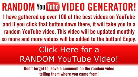 Random Youtube Video Generator. Discover new interesting, funny, famous or downright weird youtube ™ videos randomly from our random youtube ™ video generator. You click on the generate button and choose one video,.