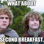 Second Breakfast Meme Generator. second breakfast is a phrase used by a character in the 2001 film the lord of the rings: Web images tagged second breakfast.