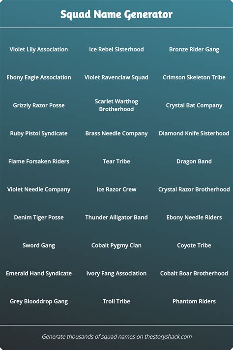 Rate the submissions and provide feedback to. Web fill out your naming brief and begin receiving name ideas in minutes. Depending on the service branch, squad. Web this name generator will give you 10 random names for squads, both military and other. Web squadhelp’s startup name generator allows you to search by industry, keywords, brand ideas, emotions, and more. 10k+ visitors in the past month 10k+ visitors in the past month Web a crowdsourced naming contest is a great way to get a unique, personalized business name.