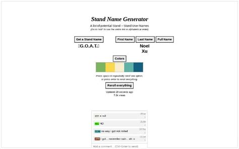 Stand Name Generator. Web generate your very own stand from jojo's bizarre adventure! (go to 'edit' to see the entire list in alphabetical order) get a stand name.