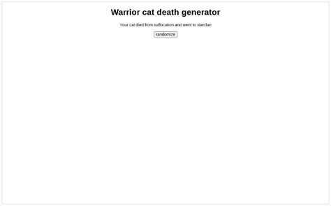 I decided to make this because there's a serious need of one of these. Your clan cat passed away from smoke inhalation. Web warrior cats death generator. His world view is mostly optimistic. Web warrior cat death generator. Web he is guided by his head, often logical and rational. He is dynamic, farsighted, eccentric,. I decided to make this because there's a serious need of one of these. Ai roleplay chat ai story generator ai image. Web please note that if you have a very large generator, or have saved it thousands of times, then it may take a while to load, and.